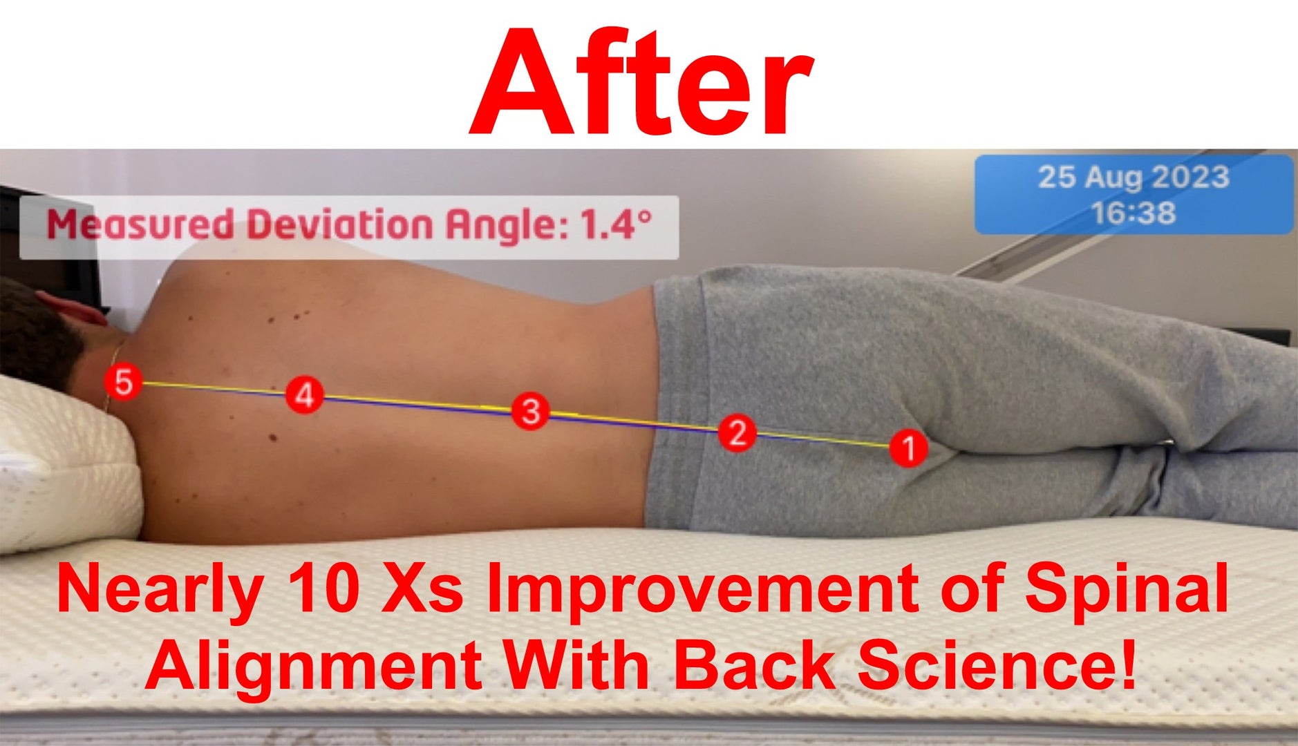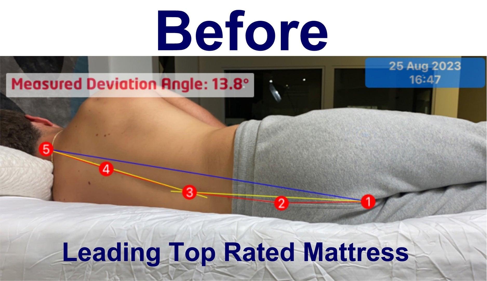 After over 22 years of designing every type of mattress, with some very successful top-rated national brands, I am most proud of what I helped achieve with the Back Science Bed, since it is the first mattress, like the name implies, uses actual science and technology to achieve a real solution for helping support the back, as well as helping those who suffer from back pain finally get the proper rest they so badly need. The Back Science® Bed is not only perfect for helping to keep your back in proper alignment due to its very specific lumbar zoning and buoyant gel foams, but it also offers the necessary contouring pressure relief to properly support all the surrounding musculature and allow the shoulders to conform with the mattress to reduce joint pressure points. Below is an image showing a demonstration of a model that was used to verify the change in alignment with the Mattress Checker App. when he was on a Back Science® Series 2 vs. one of our other softer mattresses from a different brand. When you look at the posture alignment of the model's spine with a soft mattress that has no zoning and with our Back Science® Series 2, you will see quite a difference in the alignment. The spine should be straight when you are on your side, but with the softer mattress, the alignment is 900% worse than with the specially zoned Back Science® mattress (Deviation angle of over 13.8 degrees vs. only 1.4 degrees off the 180 degree straight line). The amazing thing is that the Back Science Series 2 and 3 offer an incredible amount of joint pressure reduction and are just as comfortable as many softer types of mattresses, even though they both provide a more buoyant firm type of support in the low back, thanks to that special lumbar zoning that gives that firmer lift.