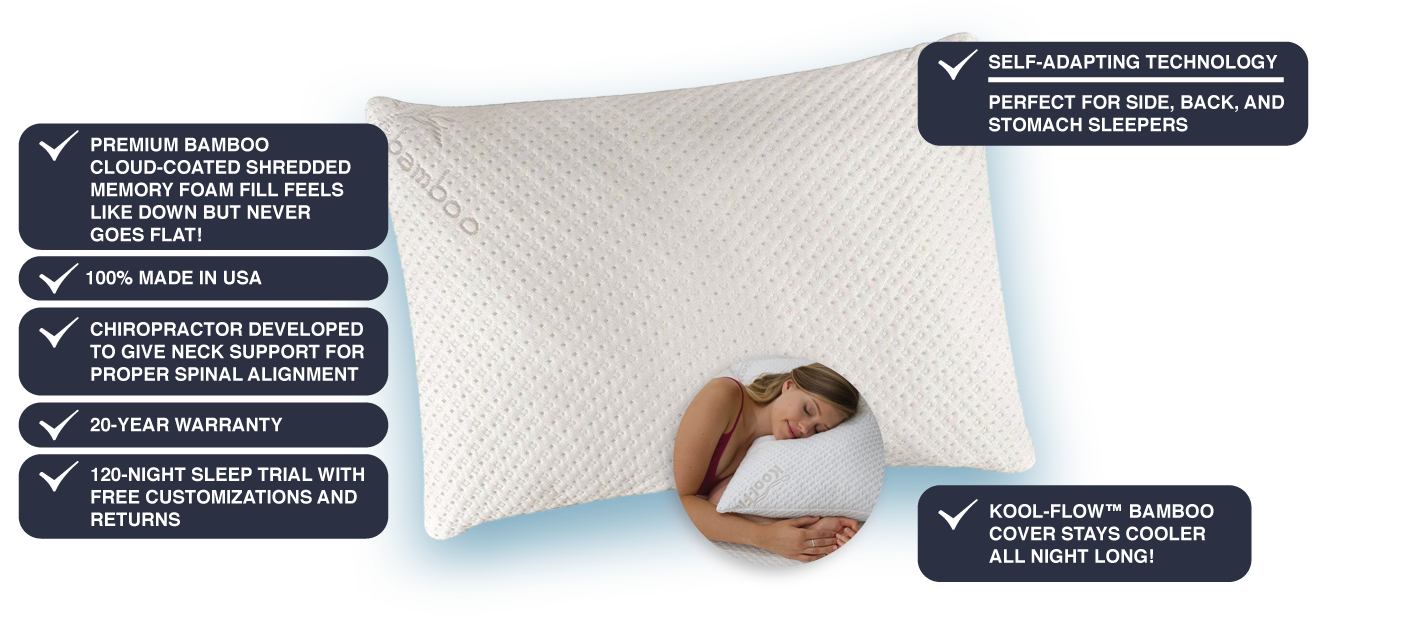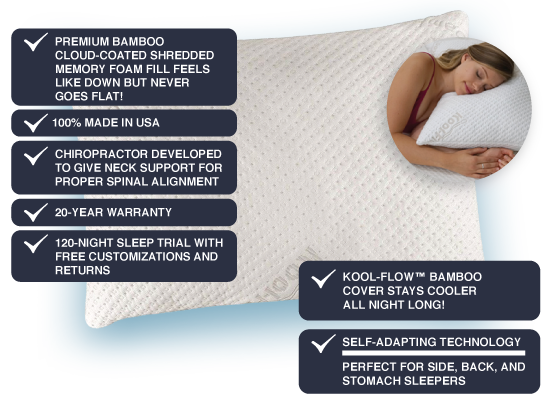 Our Kool-Flow® Micro-Vented™ Bamboo Cover and Cloud-Spun™ shredded memory foam fill gives the Tempflow® pillow unprecedented breathability by giving you full airflow circulation through the pillow that translates to a cooler night's sleep.
