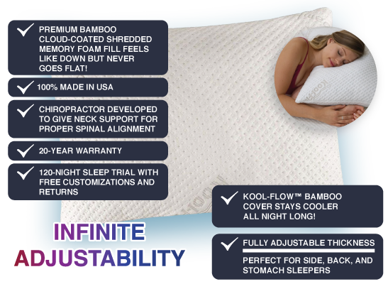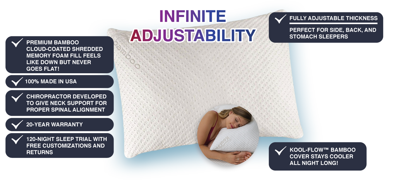 Our Kool-Flow® Micro-Vented™ Bamboo Cover and Cloud-Spun™ shredded memory foam fill gives the Tempflow® pillow unprecedented breathability by giving you full airflow circulation through the pillow that translates to a cooler night's sleep.